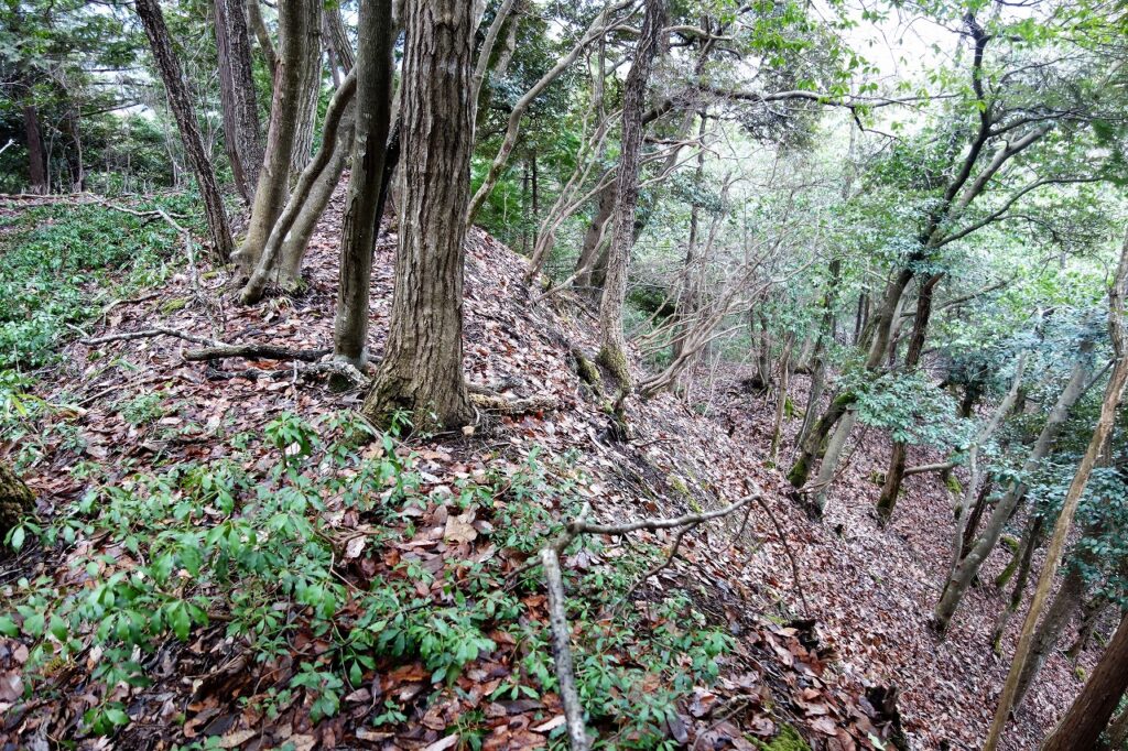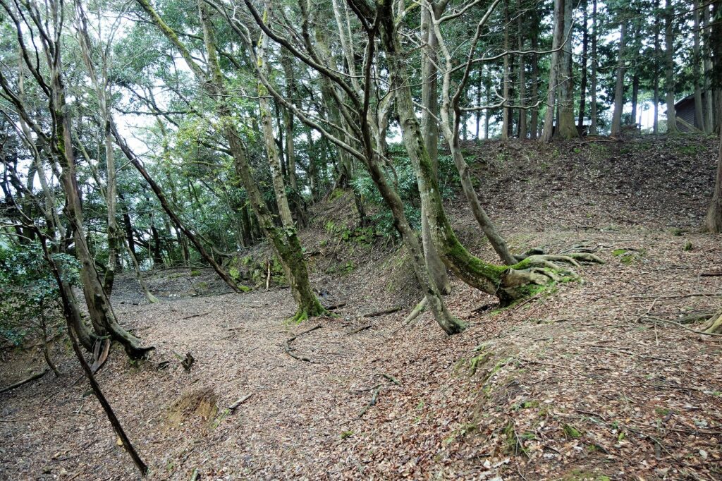 大規模な山城で見応えが十分ある。写真の一、二枚目は主郭の土塁である。三枚目は主郭から南方向にある水の手で、窪地と石垣が確認できる。説明板の詳細な縄張図を見ると、その名のとおり鶴が翼を広げたような曲輪の配置がよく分かる。説明文を読んでみよう。