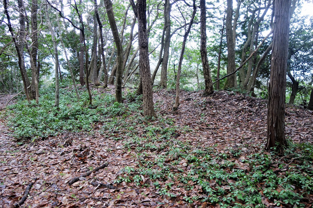 大規模な山城で見応えが十分ある。写真の一、二枚目は主郭の土塁である。三枚目は主郭から南方向にある水の手で、窪地と石垣が確認できる。説明板の詳細な縄張図を見ると、その名のとおり鶴が翼を広げたような曲輪の配置がよく分かる。説明文を読んでみよう。