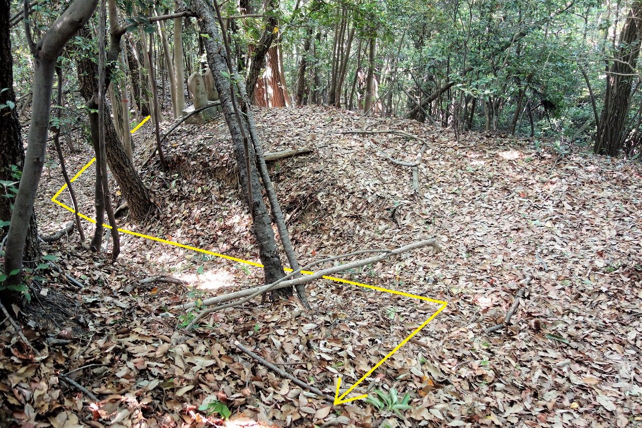 60m超の低山だからアクセスは容易だ。東側の墓地から城跡に進むと、土の要塞が現れる。一段高い主郭は土塁に囲まれており、進入するには二折れする外枡形虎口を突破せねばならない。前後左右すべての方向から迎撃を受ける可能性がある。屈曲した土塁と横堀は技巧的で美しく、山城築造史における到達点の一つと高く評価できよう。