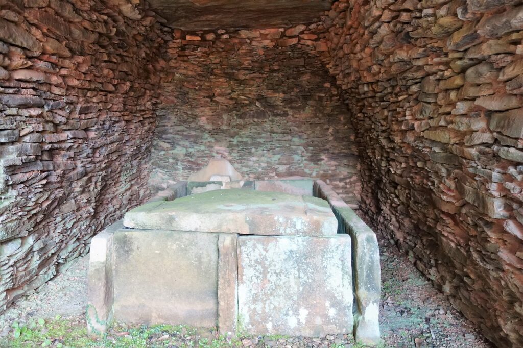 この髑髏が説明文中の男性人骨である。鏡二面は仿製つまり中国製の模倣であるが、たいへん質の高いものだそうだ。割石を丁寧に積んだ横穴式石室や夫婦墓のような組合式箱式石棺は大陸系の新しい墓制であり、被葬者が最先端の技術を積極的に導入していたことが分かる。石棺の石材は松浦砂岩である。