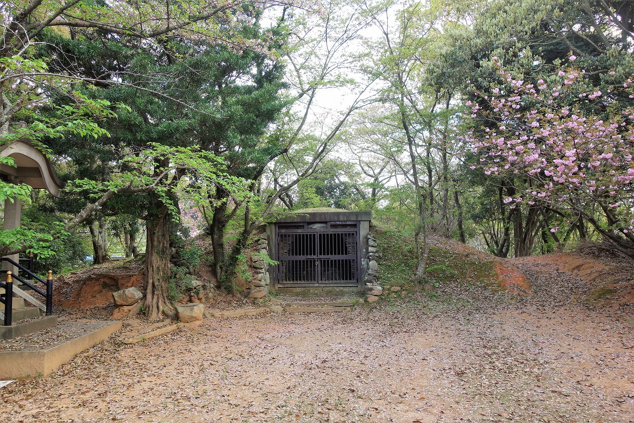 後円部の中央には、初期の横穴式石室があり、石室の中に中央の壁を共有する二基並列の組合式箱式石棺があります。その中には男性人骨と鏡二面(仿製二神二獣鏡と仿製六獣鏡)、巴形銅器、玉類(勾玉・管玉・小玉)、刀、剣、鉄鏃の副葬品が残っていたことから、この地域を代表する首長の墓と思われます。