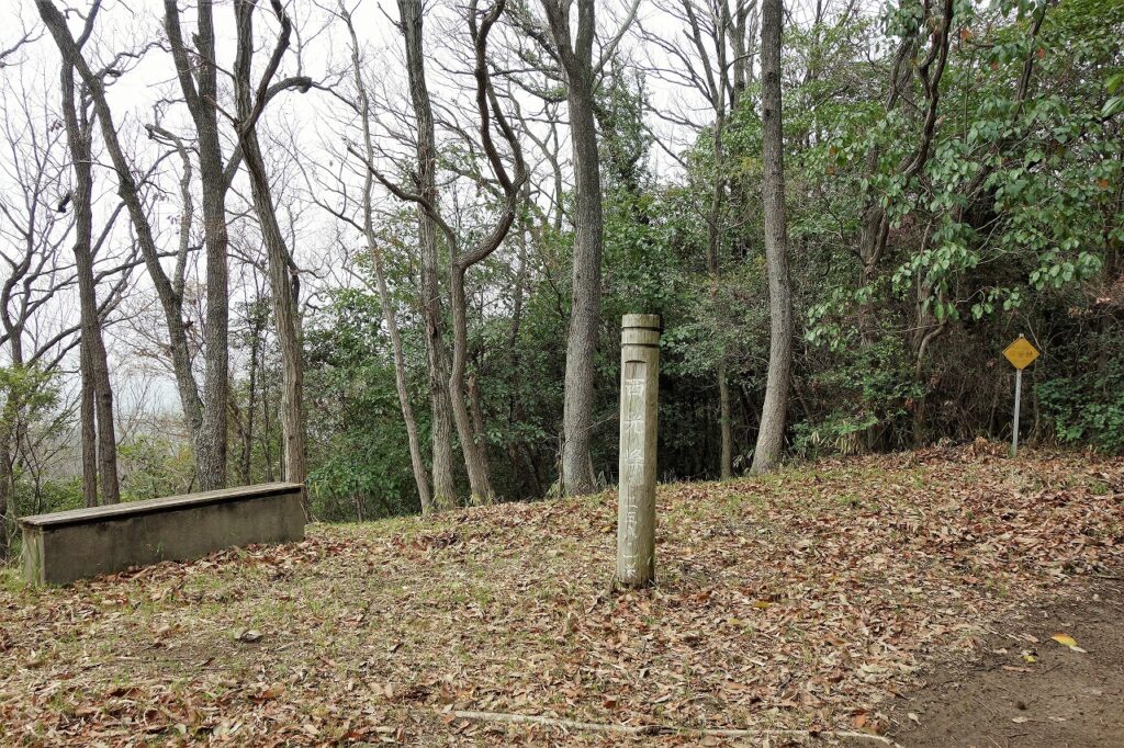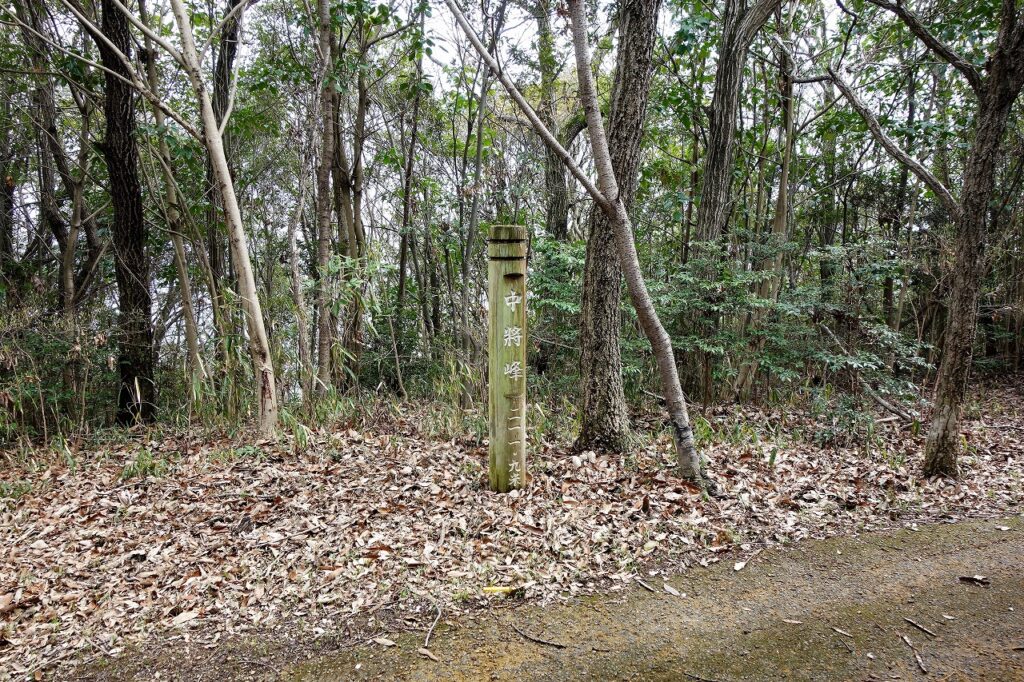西光峰から遊歩道は西へ曲がりながら向嵶へと下っていく。途中の平坦な場所が「中将峰」二一一・九米である。峰と呼びながら、峰というほど峰ではない。嵶まで下りて説明板を読むと、その理由が分かる。