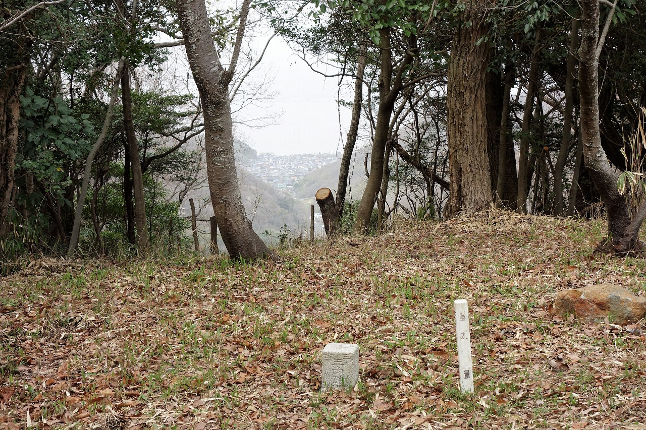 玉野市田井四丁目と五丁目、八浜町八浜の境あたりに三等三角点「三皇」がある。標高236mで向こうに霞んで見えるのが八浜の町。この絶景は木を伐採してくれた地元の方のおかげである。