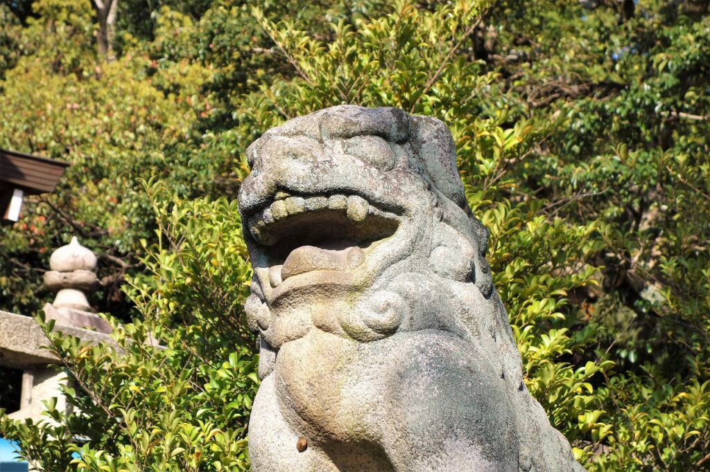 裏には「皇紀二千六百年記念」「原福蔵刻」とある。紀元二千六百年は昭和15年、五・一五事件は昭和7年だから、揮毫と建碑にはタイムラグがある。原福蔵を試みに検索すると、早島町早島にある鶴崎神社の狛犬(昭和八年)の作者としてヒットするから同一人物だろう。その狛犬の雄姿がこれだ。