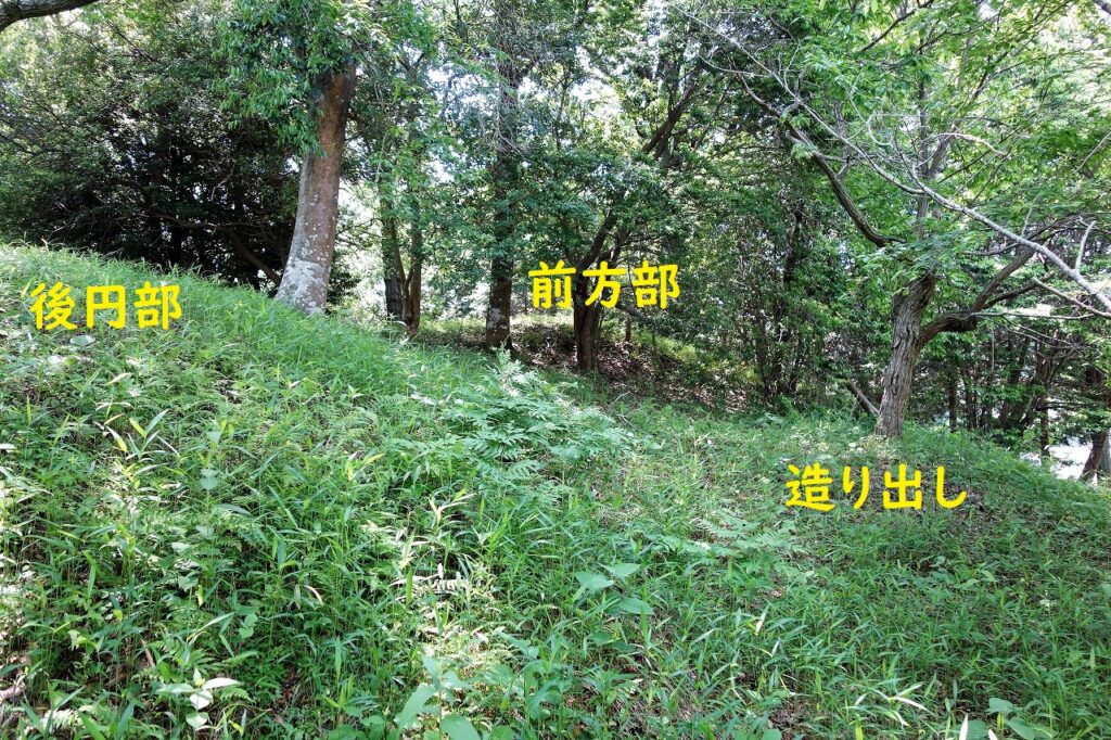 全長38mという大きさが、一目で全体像をつかむのにちょうどよい。前方後円墳であることはすぐに分かったが、横穴式石室が見当たらない。よく見ると、大きな造り出しのある反対側の神社裏に穴が開いているのが確認できた。どうやら、この奥に石室があるらしい。説明板を読んでみよう。