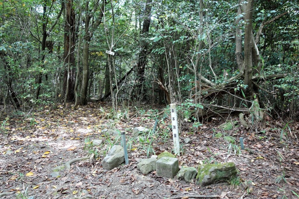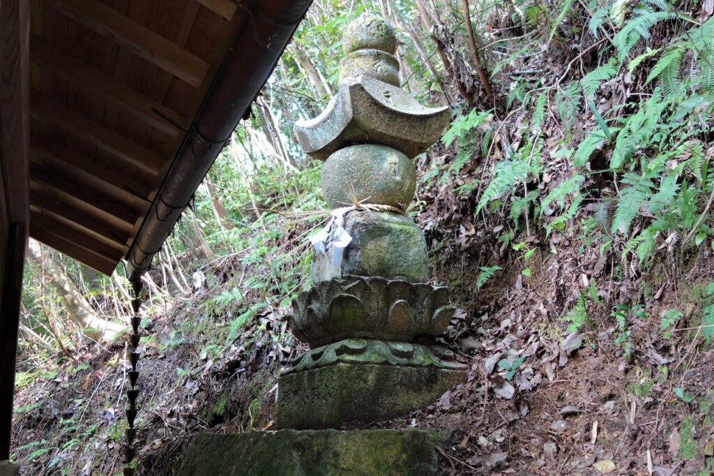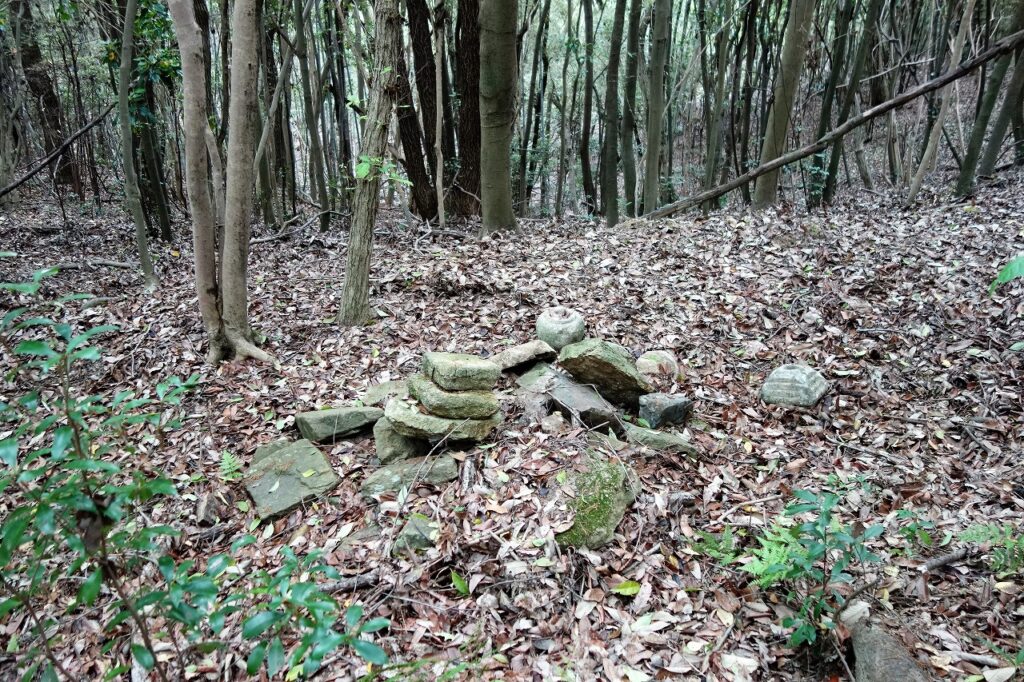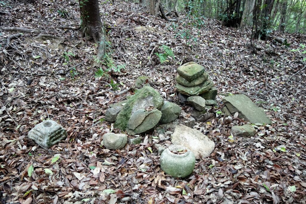 2基の塔があったようだが、散乱して無残な状態だ。猪の所為か、はたまた新たな泥棒の仕業か。下のほうには屋敷跡と思しき平坦地と石垣があった。確かに人が暮らしていた痕跡である。