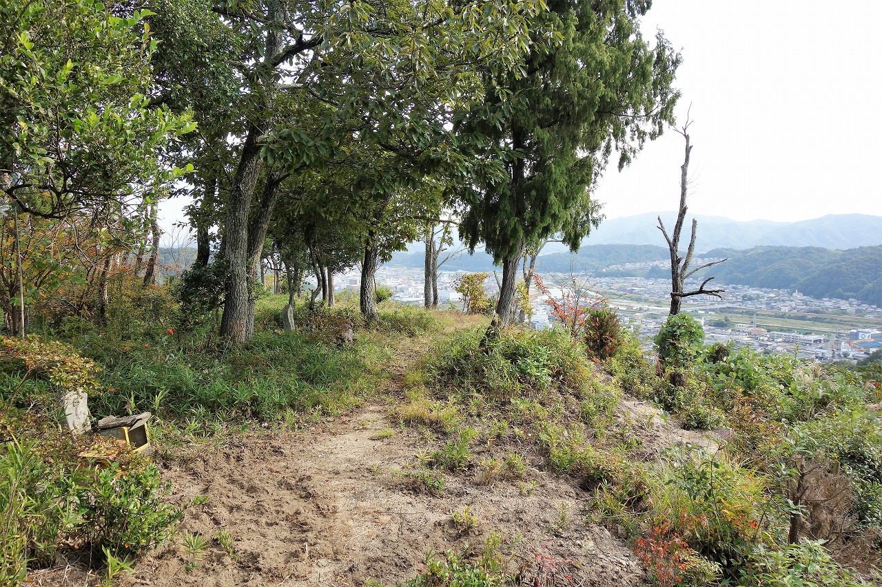 写真では新市方面の町並みが見えている。この方面に山を少し下れば石鎚神社があり、そこに城跡の説明板が設置されているので読んでみよう。