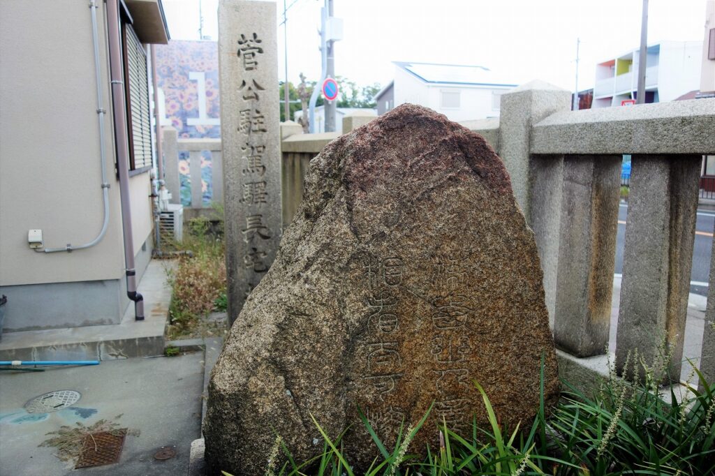 看板の向こうに「菅公駐駕駅長宅址」の碑があり、その手前の石には何やら漢詩が刻まれているようだ。