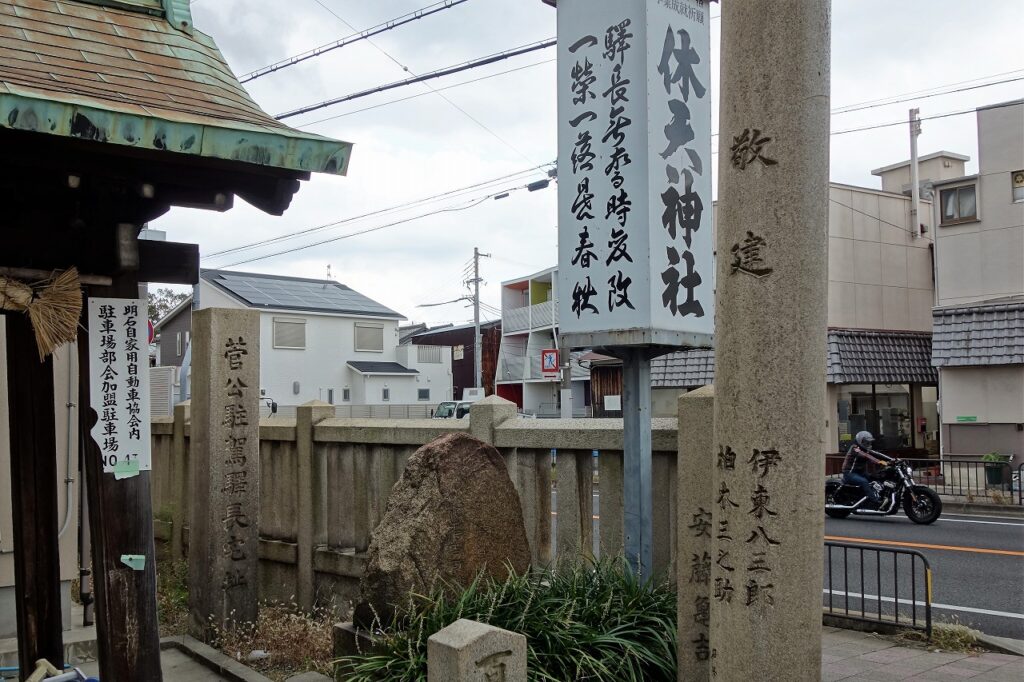 明石市大蔵天神町の休天神社に「菅公踞石」がある。石碑には「曾在駅長宅址」とも刻まれている。休天神社は菅公聖蹟二十五拝の第十五番である。