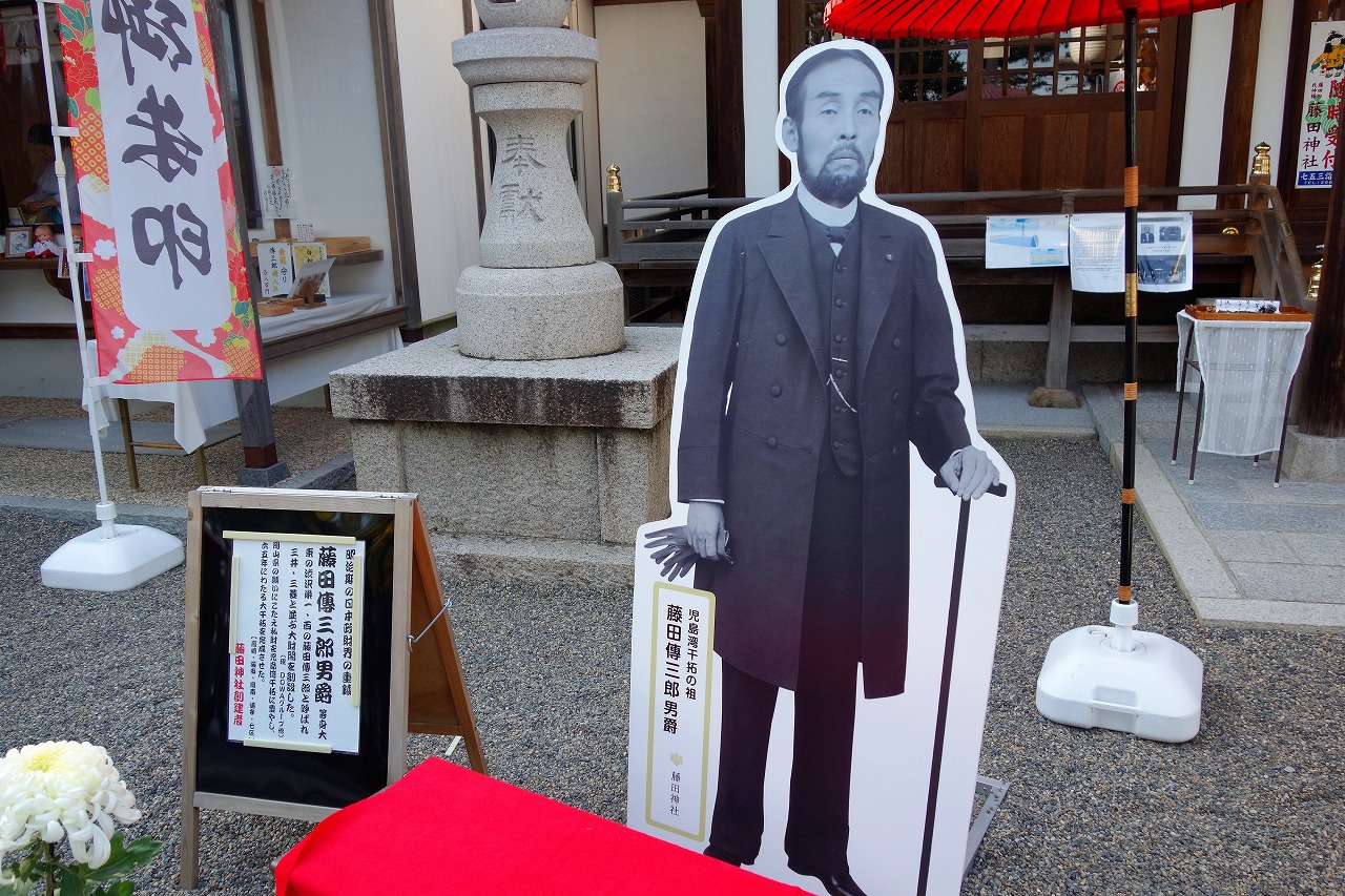 岡山市南区藤田の藤田神社前に「藤田翁頌徳碑」がある。本殿前に立つヒゲ男爵、藤田傳三郎の事績を顕彰した碑である。