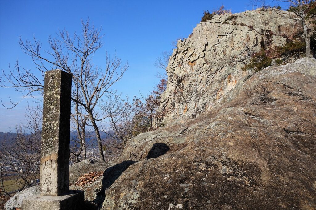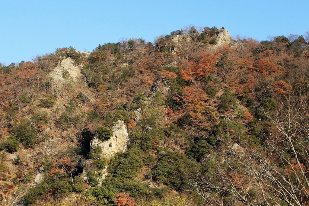 巨大な屏風岩の全容を捉えるなら、揖保川の右岸がよい。近付いて見るなら尾根の先端、觜崎橋東詰から登るとよい。ゴツゴツ岩の緩斜面で登りやすく、展望がすこぶる良い。登り口にイラスト入りの古い説明板があるから読んでおこう。
