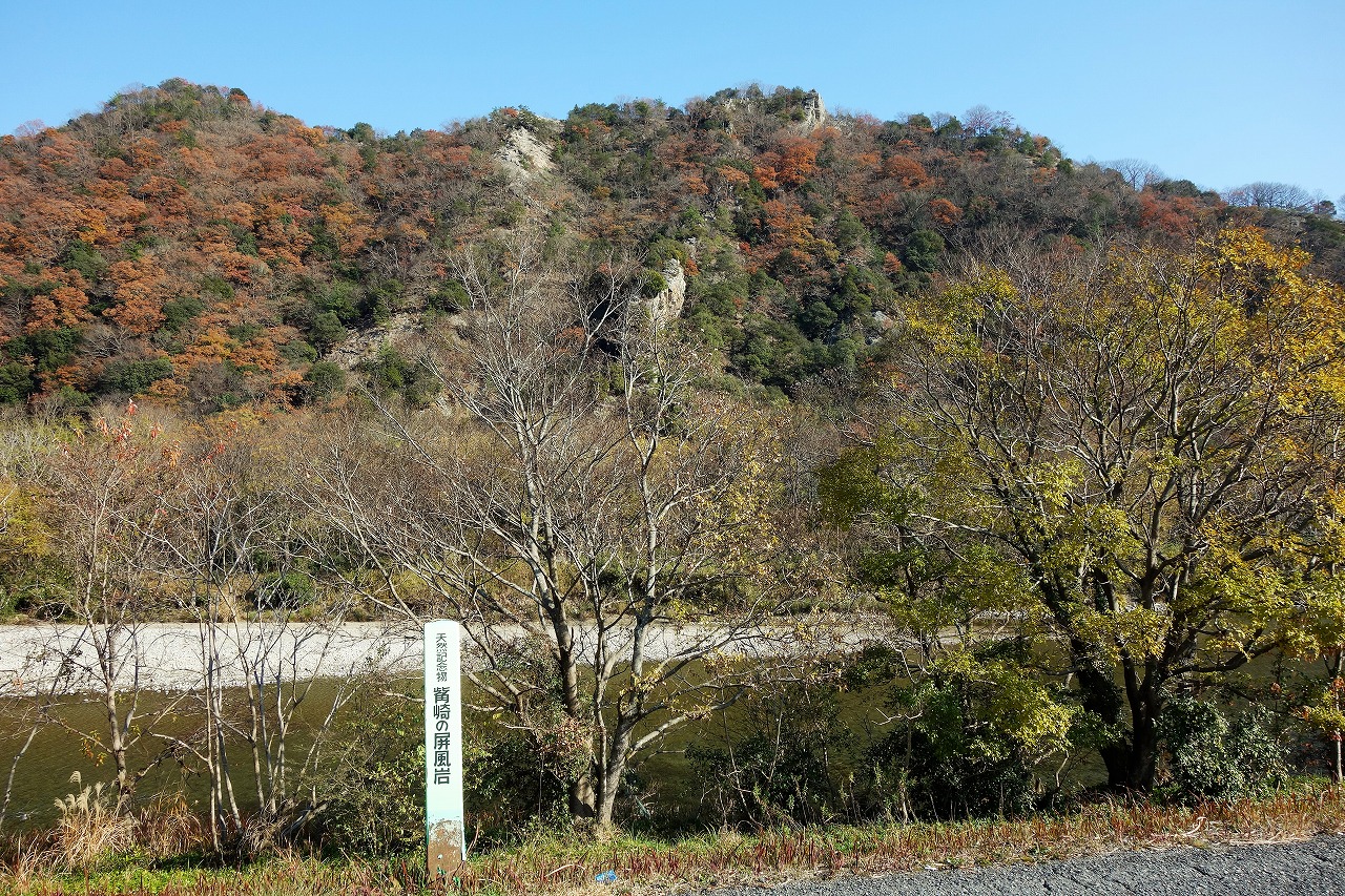 巨大な屏風岩の全容を捉えるなら、揖保川の右岸がよい。近付いて見るなら尾根の先端、觜崎橋東詰から登るとよい。ゴツゴツ岩の緩斜面で登りやすく、展望がすこぶる良い。登り口にイラスト入りの古い説明板があるから読んでおこう。