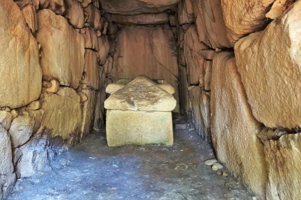 石棺は家の形をしており、材質は井原市浪形で産出する貝殻石灰岩(浪形石)である。