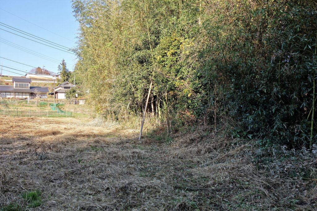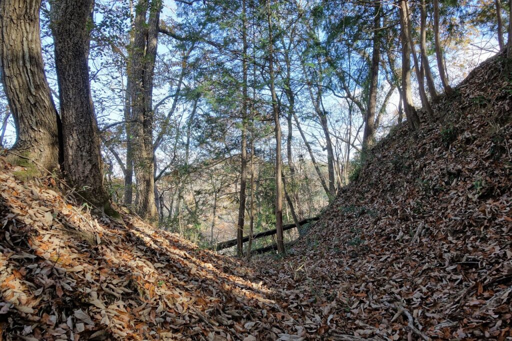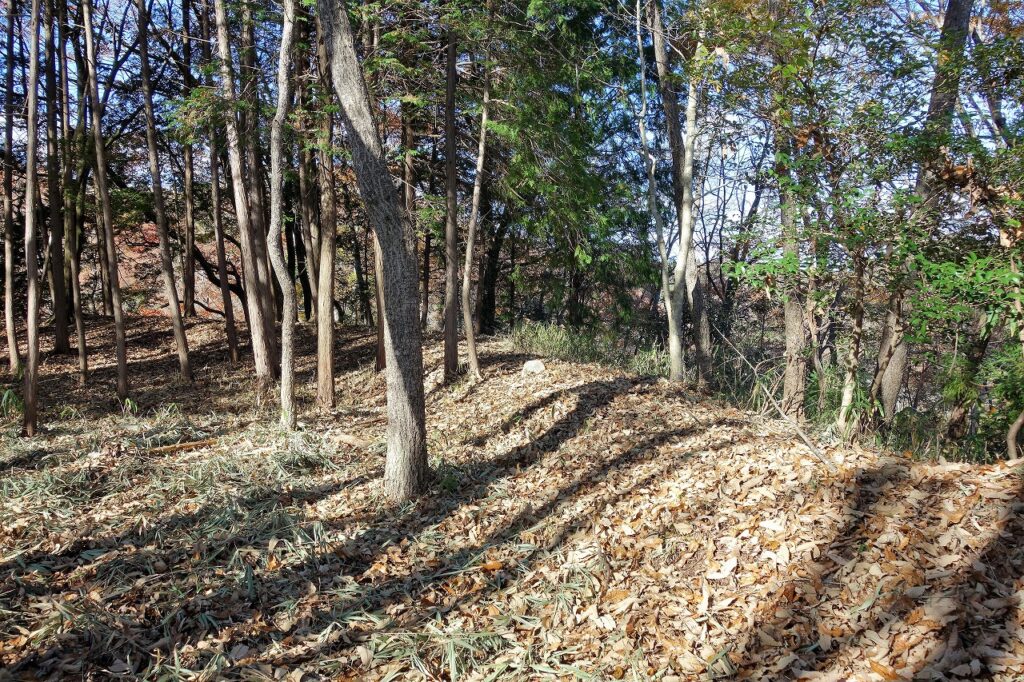地理院地図を見ると、ちょっとした舌状台地になっていることが分かる。写真は「城の内」東端の土塁で、その東側は竹藪になっているが、確かに一段低くなっている。