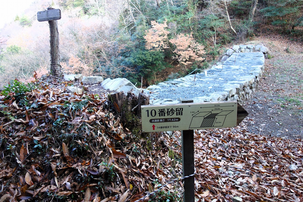 案内図によれば砂留は36か所あり、うち14か所が整備されて見学できる。私は岩角山縦走路から急斜面を下って砂留群へ入り、13,14,10,8,7…と、番号をほぼ逆順に見学した。登山道入口に説明板があるので読んでみよう。