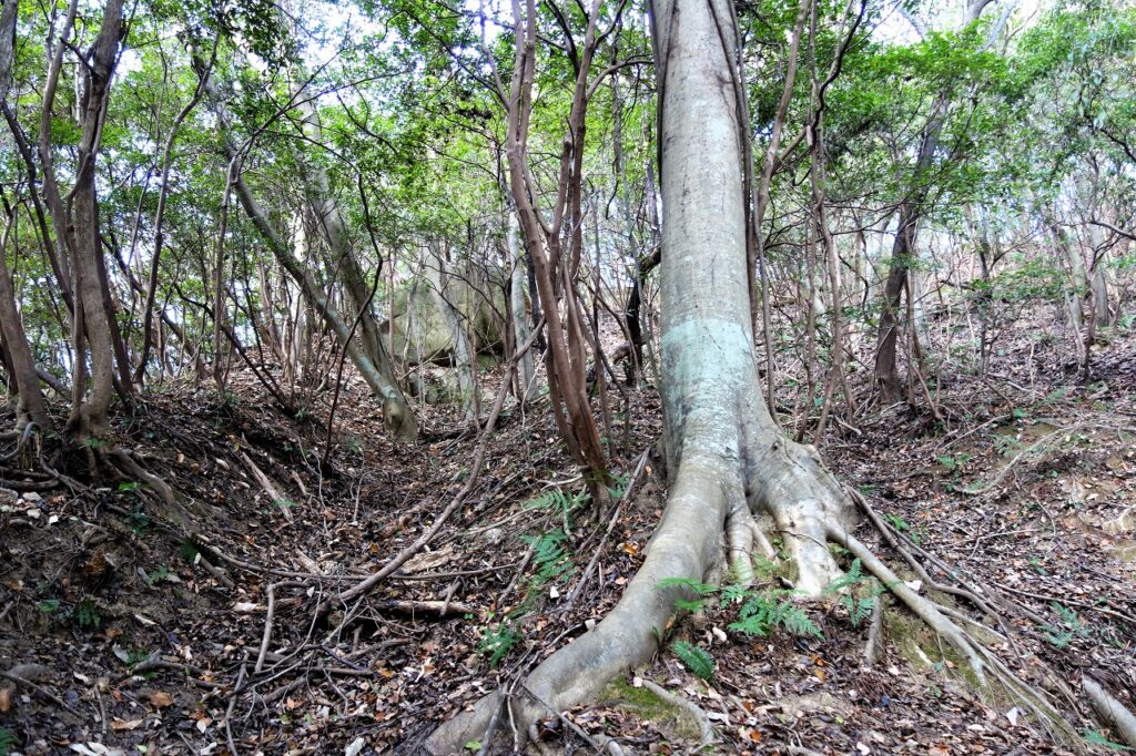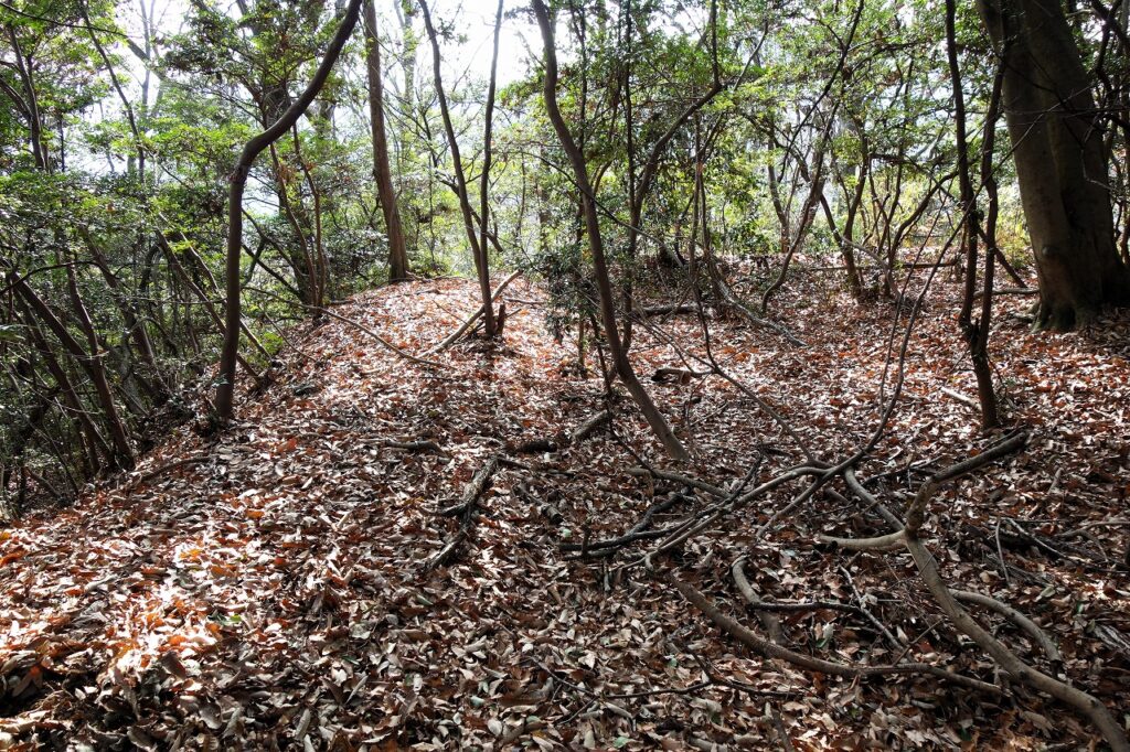 鞍部に下りて南の峰に登ってみよう。曲輪はそうでもないが、斜面に築かれた畝状竪堀に見どころがある。