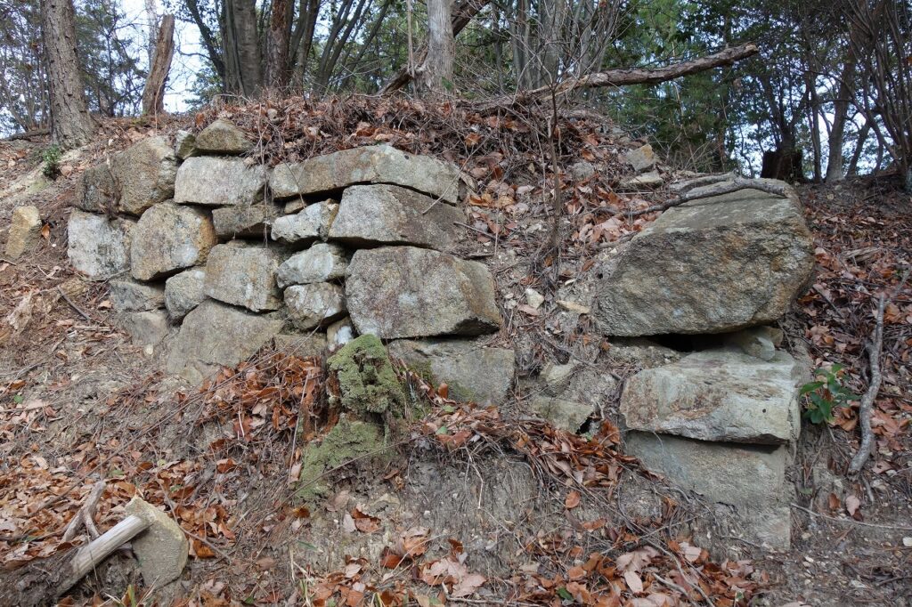 主郭にあるのは四等三角点「経山」である。標高は372.62m。ところどころに石垣が残っている。これは北西側の遺構だ。