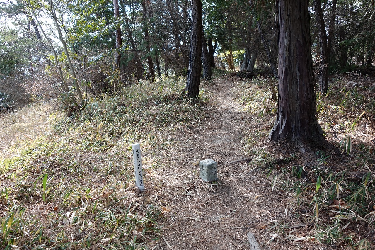 主郭にあるのは四等三角点「経山」である。標高は372.62m。ところどころに石垣が残っている。これは北西側の遺構だ。