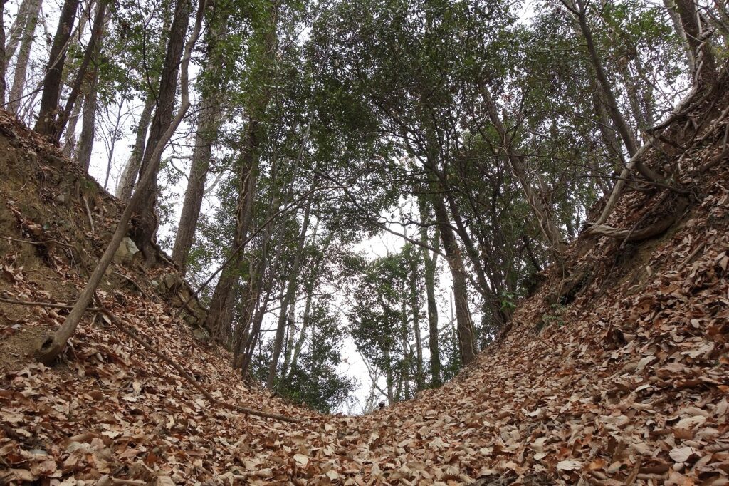 南北二つの曲輪があり、北から進入すると南曲輪の手前に二条の堀切がある。奥の堀切は息を呑む迫力で現れる。そろりそろりと下りてみよう。