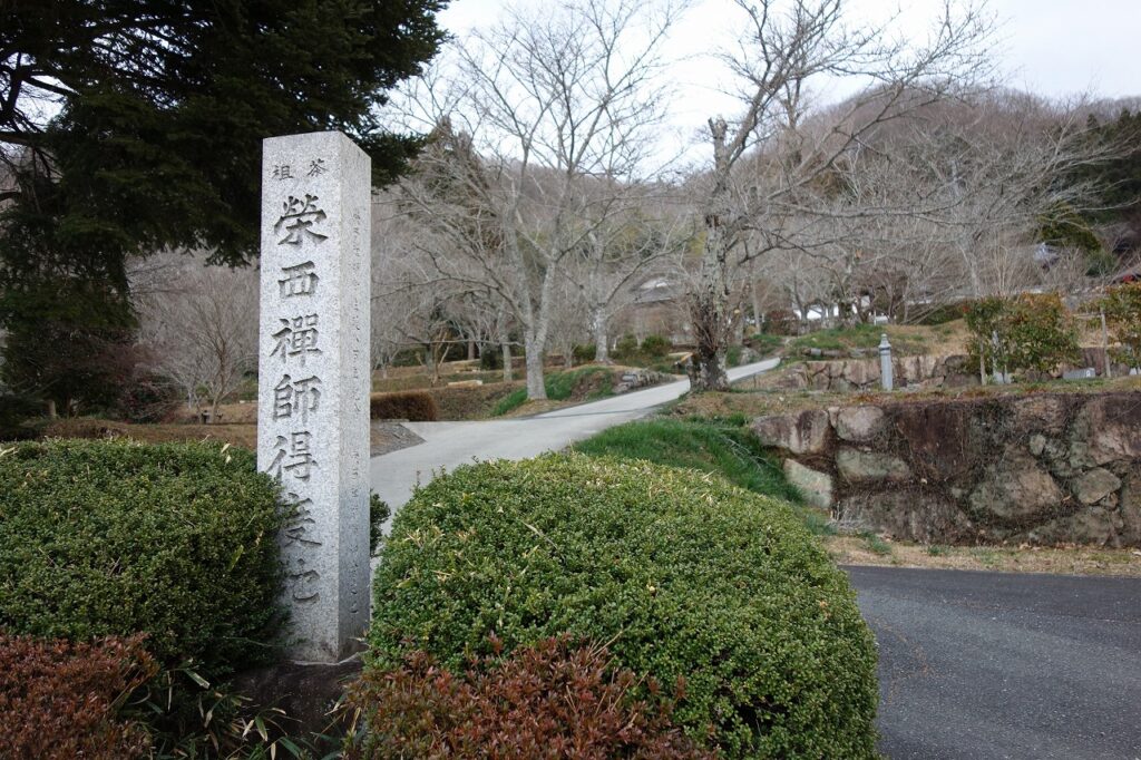 岡山市北区日近(ひぢかい)の安養寺(臨済宗)は「茶祖栄西禅師得度地」である。標柱は、栄西禅師御生誕八百年を記念して、昭和十五年四月に建てられている。
