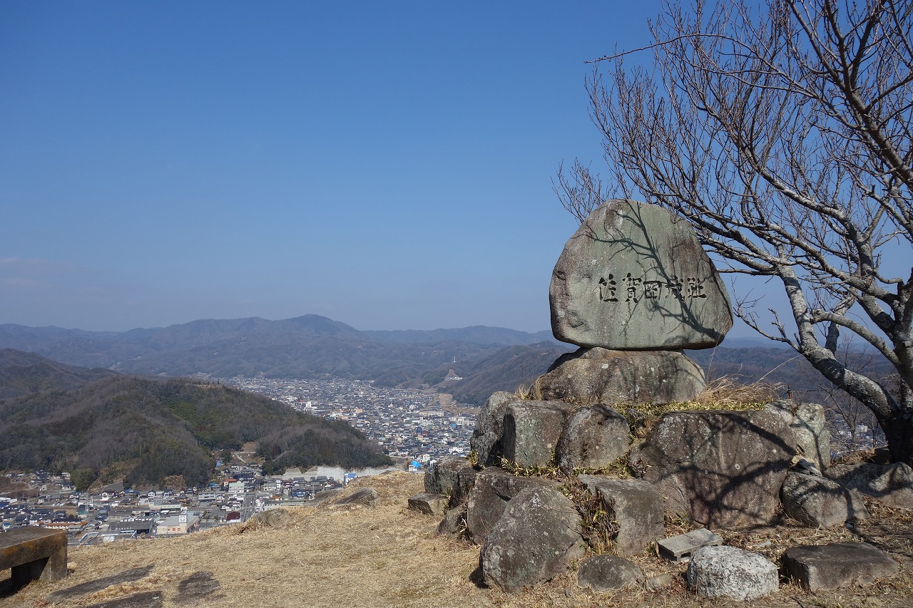 主郭にある石碑には「佐賀田城趾」と刻まれている。裏面に説明があるので読んでみよう。