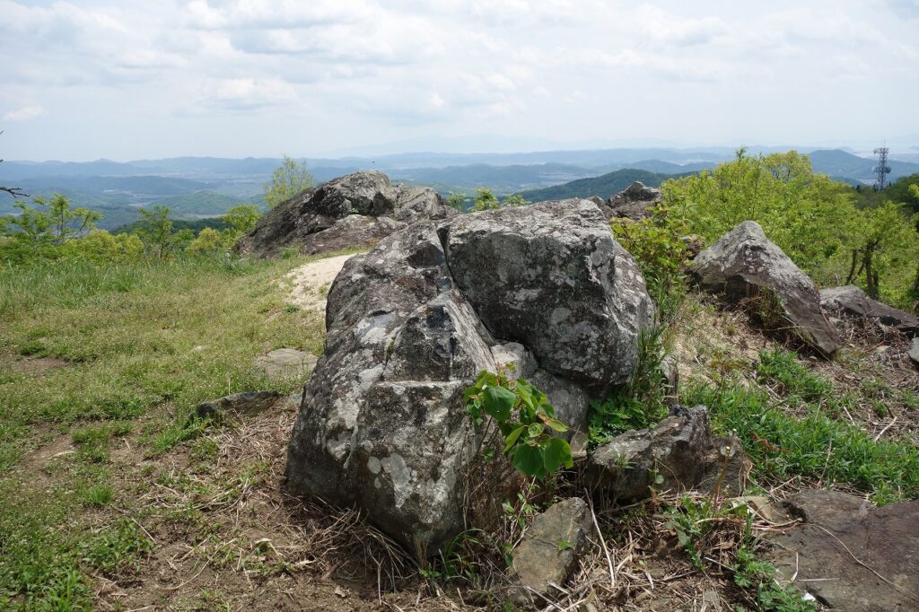 頂上に磐座らしき岩がある。カメラは瀬戸内市の方面を向いている。駐車場付近にある説明板は合併後に修正されているが、かつては次のように記されていたようだ。