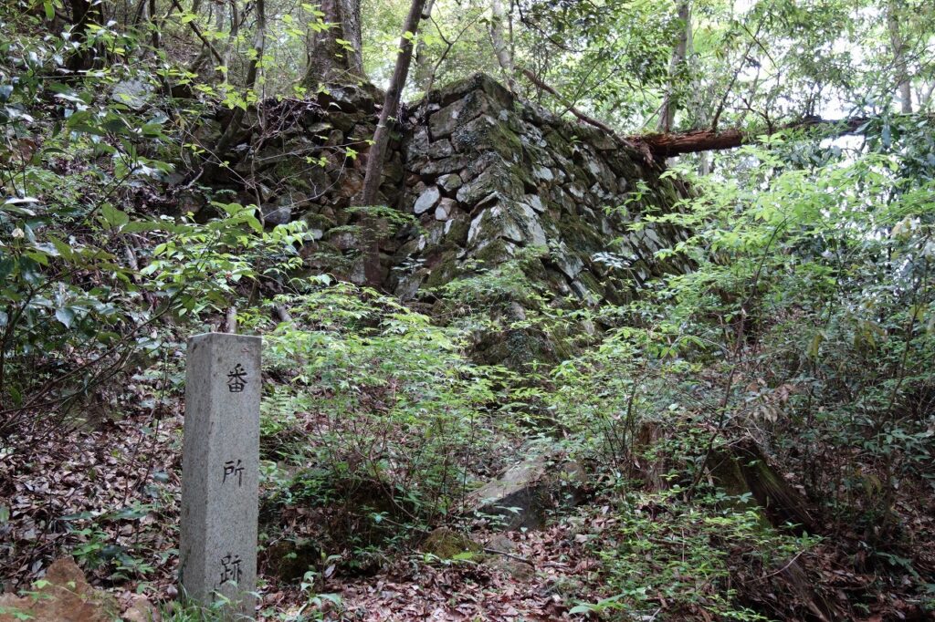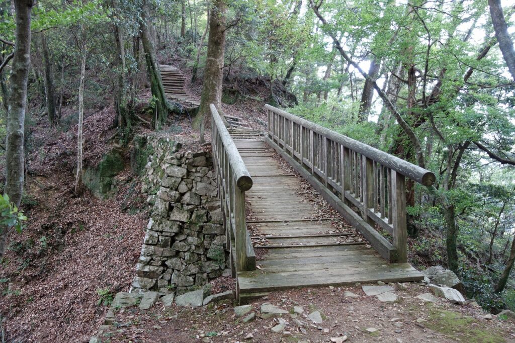 駐車場から「大松山つり橋」を渡り、少し下ると「番所跡」がある。この先は「切通」と呼ばれる堀切で、同じ谷に今渡った吊橋が架かる。「切通及び番所跡」以下、下線部は国指定史跡「備中松山城跡」を構成する場所である。