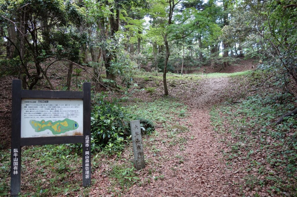 標高470mの大松山山頂と西に延びる尾根上に位置しています。延応2年(1240)に有漢郷(現高梁市有漢町)の地頭であった秋庭三郎重信が築城したと伝えられています。臥牛山ではじめて城が築かれたところで、中世城郭の遺構が残っています。