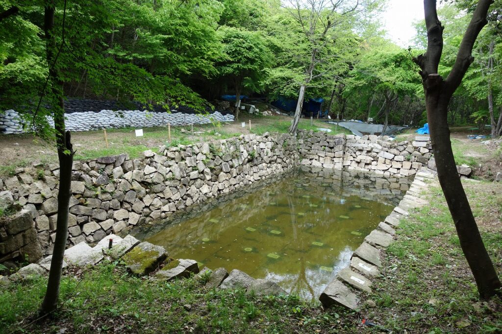 坂道を上ると「大池」がある。プールのように整備されているが、これは近世期の水の手である。「血の池」という物騒な名称も伝わる。近くの説明板には、次のように記されていた。