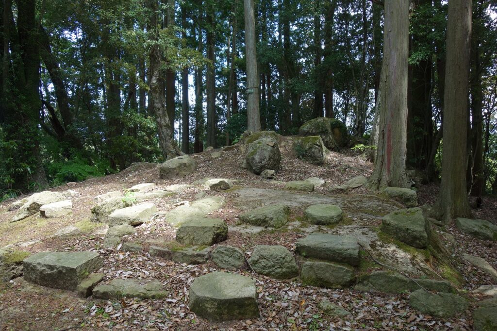 東西に連なる6ヵ所の平坦面がみられ、周辺には腰曲輪と考えられる小さな平坦面が数ヵ所、井戸と考えられる石組遺構が1ヵ所あります。平坦面は東から本丸、二の丸、三の丸と呼ばれており、二の丸と三の丸の間には堀切があります。発掘調査によって、この堀切は箱堀状であることが分かりました。また、本丸と二の丸の間にも堀切が存在する可能性が高くなっています。