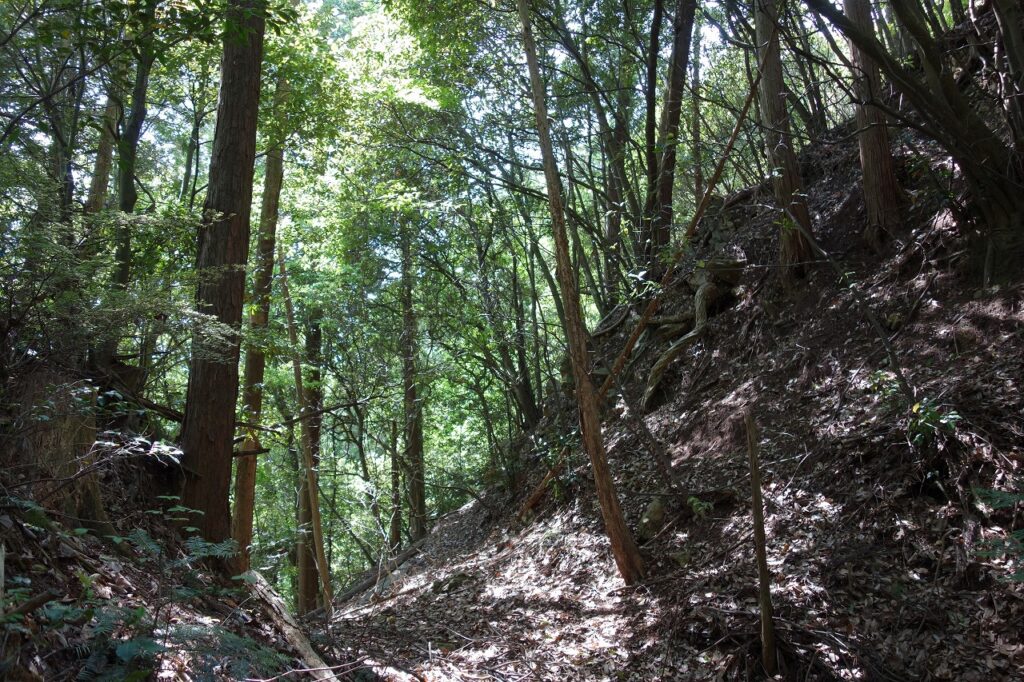 天神の丸から南へ進むと「相畑城戸(あいはたのきと)跡」がある。写真は東に伸びる尾根を断ち切る大きな堀切である。中世山城らしさが感じられる。