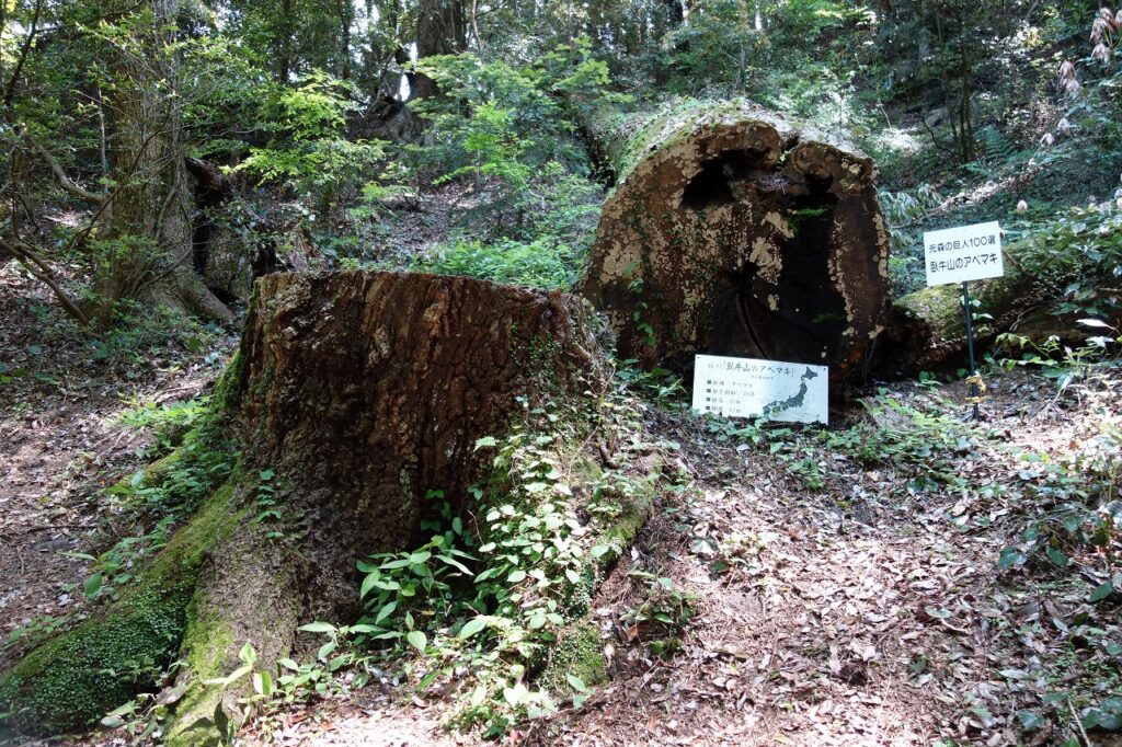 途中に大きな木が倒されていた。林野庁「森の巨人たち百選」に岡山県内で唯一選定された巨樹である。平成17年に枯死し、同29年に伐倒処理されたという。