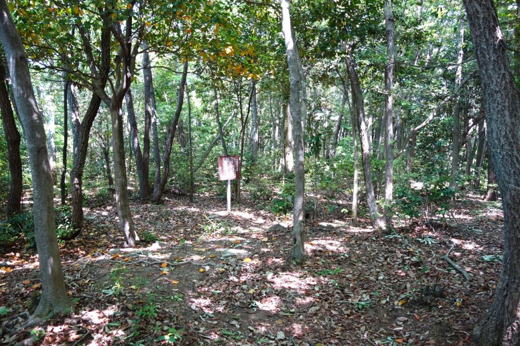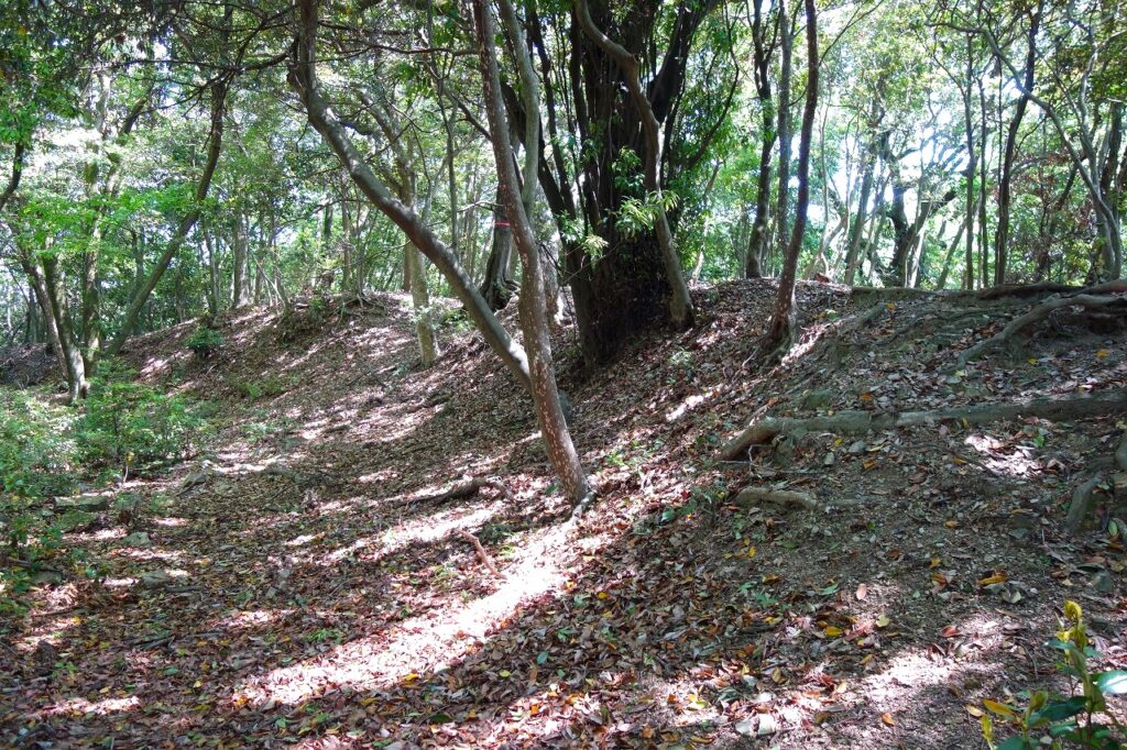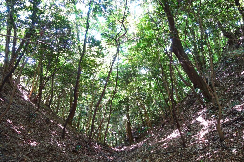 私は真備側からアクセスし本丸に登った。6段に渡る連郭式の縄張で、最奥部に分厚い土塁があり、大堀切はその向こうにある。斜面の木々が視線を遮り、奈落へと続くかのようだ。その底に導くためのロープが垂れ下がっているので、そろりそろりと下りてみた。