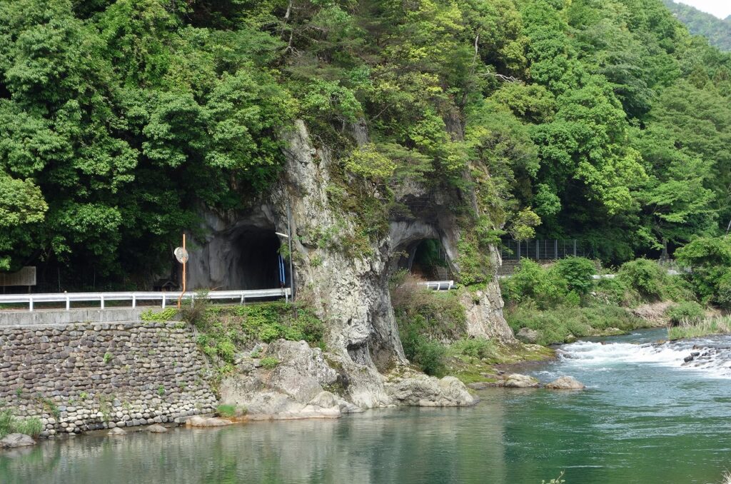 対岸から見ると、今も川に面した岩端には桟橋を差した四角い穴が残っている。しかし、桟橋は荒天の度に落ちるので、明治三六年頃に村民が二年がかりで隧道を掘った。