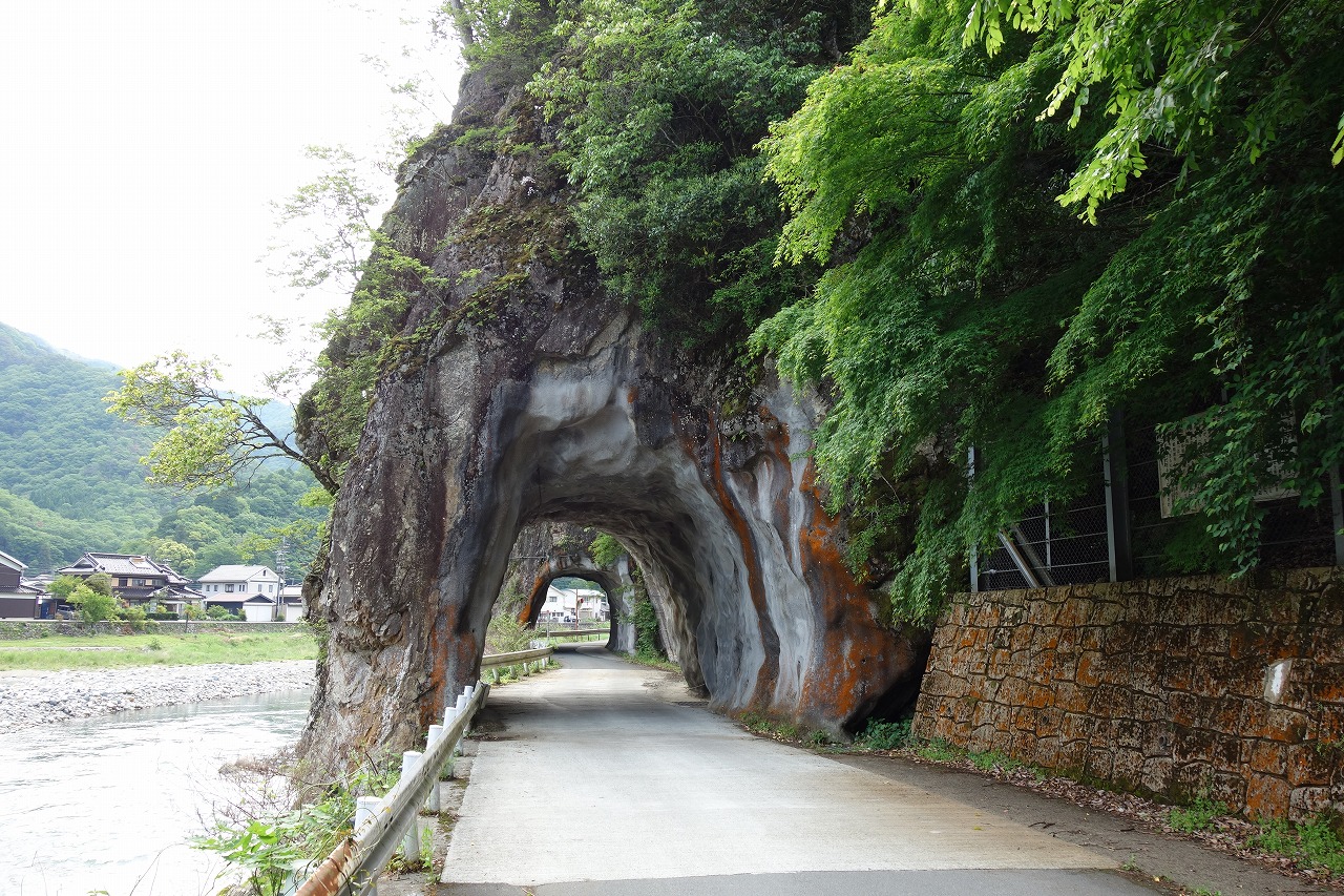 対岸から見ると、今も川に面した岩端には桟橋を差した四角い穴が残っている。しかし、桟橋は荒天の度に落ちるので、明治三六年頃に村民が二年がかりで隧道を掘った。