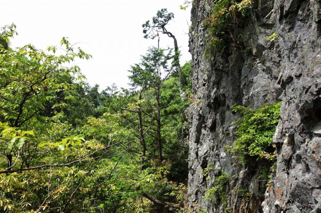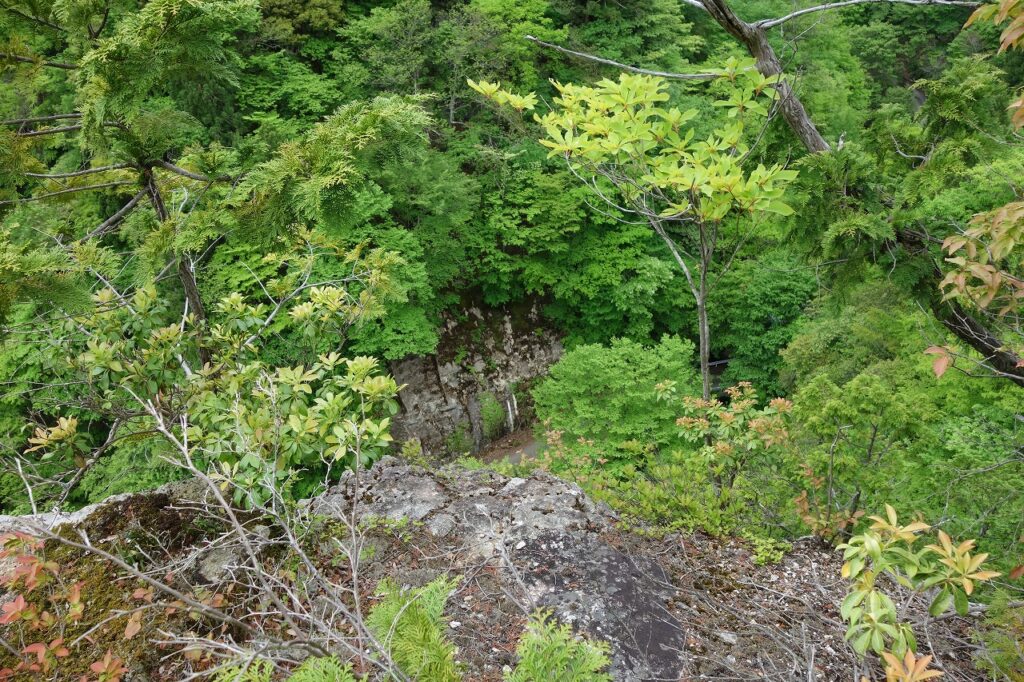 中世山城のような堀切だが、両端は奈落の底へと続いているらしい。気を取り直し、木や岩の安全を確認しながら正面の岩によじ登った。