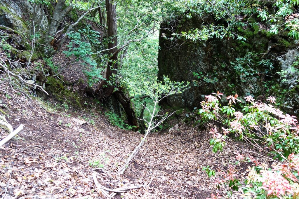 城のある岩は垂直に立っており、手も足も出ない。生えている木をつかんでそろりと移動するが、下を見れば奈落の底だ。ここは勇気ある撤退しかない。そろりそろりと道へ下り、思案すると背後の山から登城できると気が付いた。