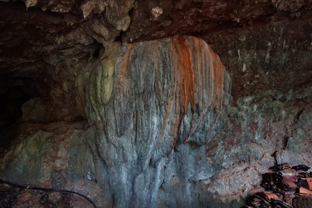 この石灰岩の巨大礫は、おそらく秋吉帯に属するペルム紀付加体で、もとは暖かい太平洋にできたサンゴ礁だったのだろう。鍾乳洞が発達する秋吉台、帝釈台、阿哲台も同じ仲間で、ここでも鍾乳石の成長を見ることができる。