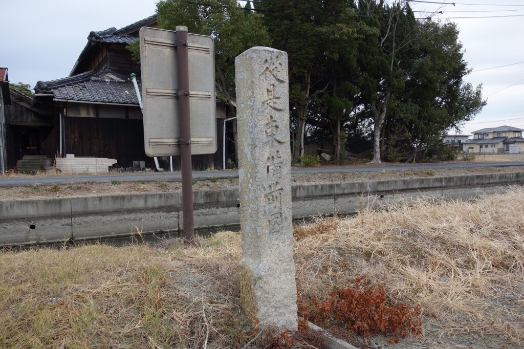 十本の国境標石を補う境界石だという。地名の境界としての役割があったのはいつまでなのか。調べてみると、この畦道より北側はかつて備中国都宇郡(帯江)沖新田村で帯江戸川氏領だった。南側は備前国児島郡鶴崎新田だった。