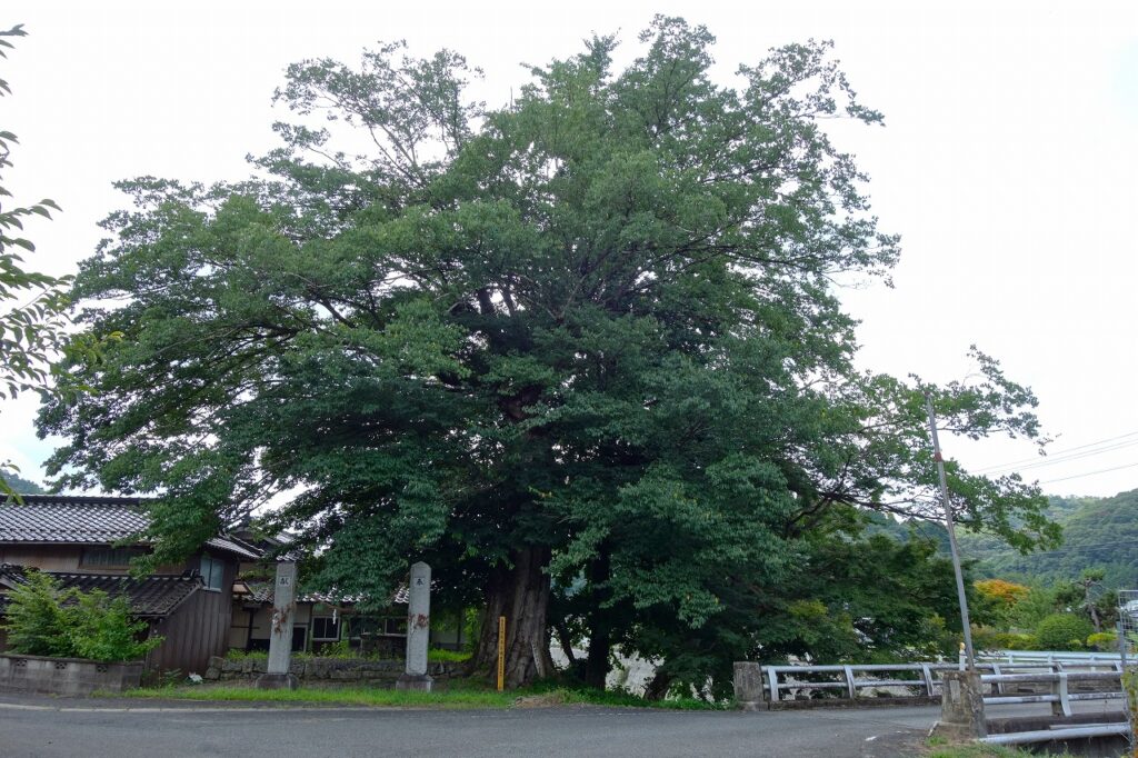 ずいぶん後ろまで下がって、樹姿全体をカメラに収めた。樹勢盛んで枝は四方八方へと広がり、地域の象徴的存在として愛されている。根元にある真新しい標柱には、次のように記されている。