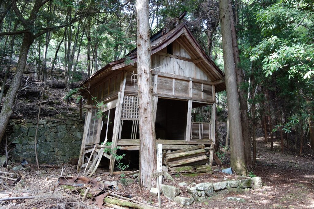 「開山跡」の左斜め下に「鎮守山王宮跡」(平成八年四月一日 英田町教育員会)の標柱と建物がある。『英田町の地区誌』にも「山王様」として掲載され、「真木山頂に残っている唯一の建造物で朽ち果てるままである。」と説明されている。この説明から三十年以上の歳月を経た令和4年夏の写真撮影時には朽ち果てていなかったが、その後、倒壊した。