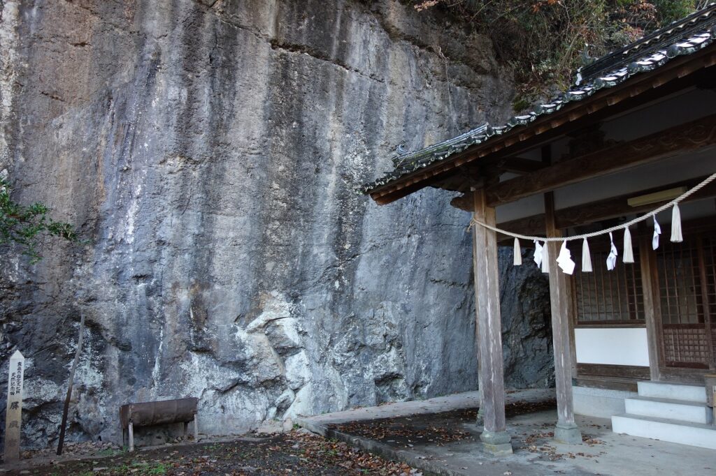 岩肌が白っぽい。ここ旧北房町域はカルスト地形で有名だ。ここもその一つと考えたらよいのだろうか。真庭市教育委員会『真庭市の文化財』には、次のように記されている。
